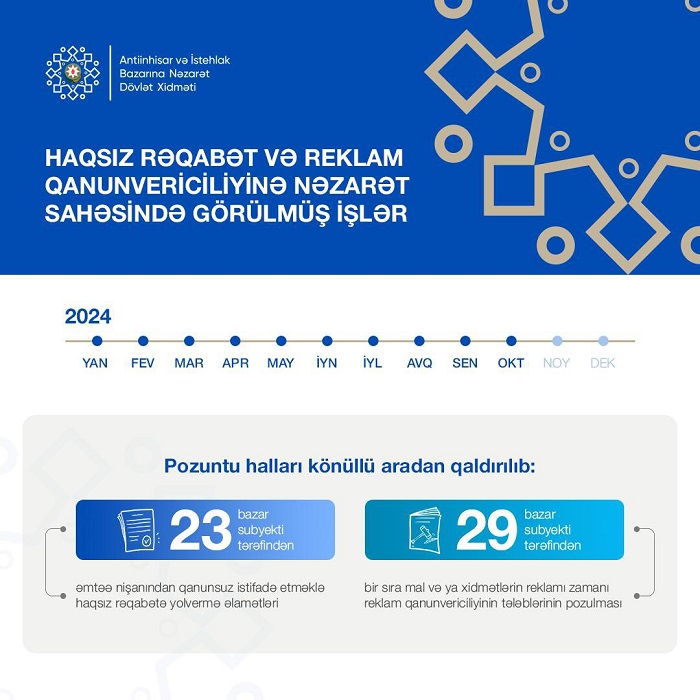 Bu ilin yanvar-oktyabr ayları ərzində Antiinhisar və İstehlak Bazarına Nəzarət Dövlət Xidməti tərəfindən haqsız rəqabətə yolvermə ilə əlaqədar