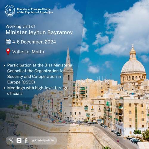 Bu gün – dekabrın 4-də xarici işlər naziri Ceyhun Bayramov Malta Respublikasının paytaxtı Valetta şəhərinə işgüzar səfərə yola düşüb.