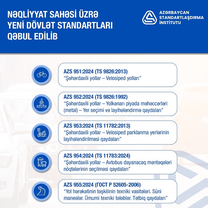 İqtisadiyyat Nazirliyi yanında Antiinhisar və İstehlak Bazarına Nəzarət Dövlət Xidmətinin tabeliyində olan Azərbaycan Standartlaşdırma İnstitutu (AZSTANDART) tərəfindən nəqliyyat sahəsi üzrə yeni dövlət standartları qəbul edilib.