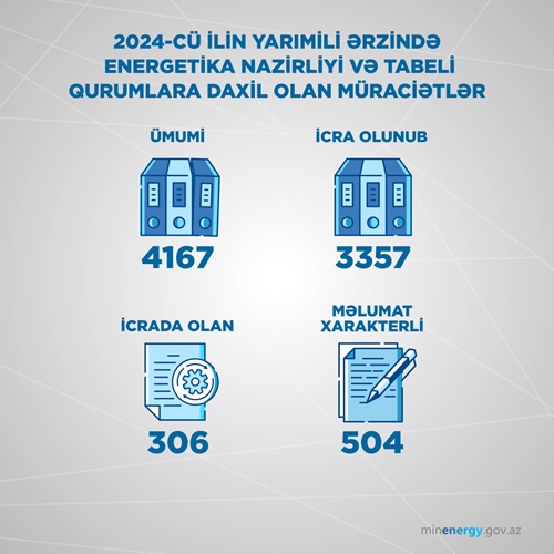 2024-cü ilin birinci yarımili ərzində Energetika Nazirliyi və tabeli qurumlara 4167 vətəndaş müraciəti daxil olub.
