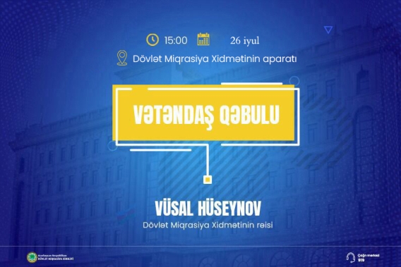Dövlət Miqrasiya Xidmətinin rəisi Vüsal Hüseynov 26 iyul saat 15:00-da Xidmətin aparatında vətəndaş qəbulu keçirəcək.