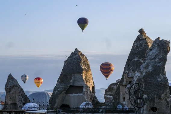 Türkiyənin Kapadokiya bölgəsində göyərtəsində 22 sərnişinin olduğu isti hava balonu yerə düşüb və qayaların arasında qalıb.