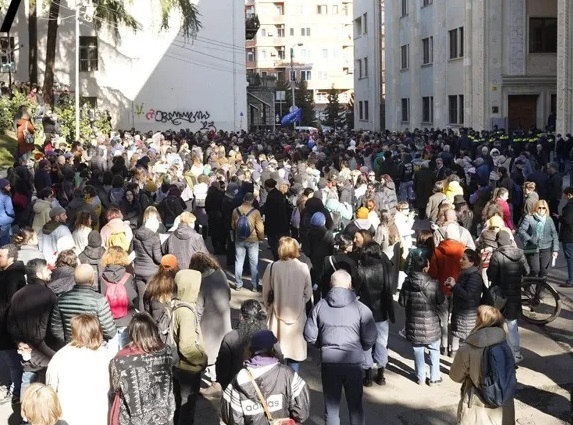 “Xarici təsirin şəffaflığı haqqında” qanun layihəsinin müzakirəsinə etiraz edən vətəndaşlar yenidən parlament binası önünə toplaşıblar.
