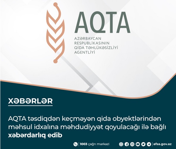 Qida Təhlükəsizliyi Agentliyi ölkə ərazisində qanunvericiliyin tələbləri çərçivəsində qida təhlükəsizliyinin təmin olunması və istehlakçı hüquqlarının müdafiəsi sahəsində tədbirləri davam etdirir.