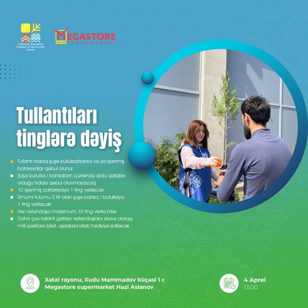 Ekologiya və Təbii Sərvətlər Nazirliyi və “Megastore” marketlər şəbəkəsinin birgə təşkilatçılığı ilə “Tullantıları tinglərə dəyiş” aksiyası 4 aprel tarixində Xətai rayonunda Megastore supermarketin qarşısında keçiriləcək.
