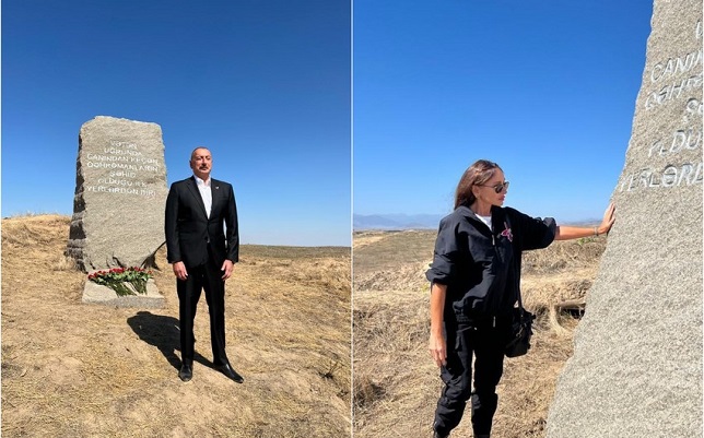 “Şəhidlərimizin şərəfinə bu abidə – bu qaya parçası Qaraxanbəyli kəndinin yaxınlığında ucaldılıb. Qaraxanbəyli kəndi və digər beş kənd İkinci Qarabağ müharibəsinin ilk günündə azad edildi”.
