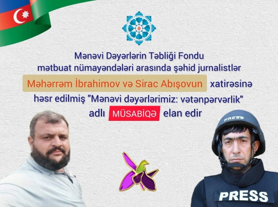 Azərbaycan Respublikasının Dini Qurumlarla İş üzrə Dövlət Komitəsinin tabeliyində Mənəvi Dəyərlərin Təbliği Fondu qarşıdan gələn 22 iyul – Milli Mətbuat və Jurnalistika Günü ilə əlaqədar olaraq mətbuat nümayəndələri arasında şəhid jurnalistlər Məhərrəm İbrahimov və Sirac Abışovun xatirəsinə həsr edilmiş “Mənəvi dəyərlərimiz: vətənpərvərlik” adlı məqalə müsabiqəsi elan edir.
