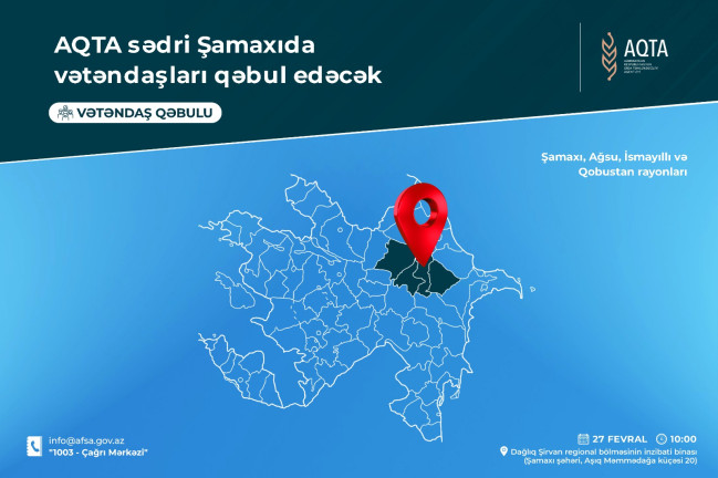 Qida Təhlükəsizliyi Agentliyinin sədri Qoşqar Təhməzli fevralın 27-si saat 10:00-da Agentliyin Dağlıq Şirvan regional bölməsinin inzibati binasında (Şamaxı şəhəri, Aşıq Məmmədağa küçəsi 20) Şamaxı, Ağsu, İsmayıllı, Qobustan rayonlarından olan vətəndaşların qəbulunu keçirəcək. Tezadlar.az xəbər verir ki, vətəndaşlar ad, soyad, ata adı, müraciətin məzmunu, yaşayış ünvanı və telefon nömrəsini göstərməklə info@afsa.gov.az elektron ünvanına rəsmi şəkildə […]