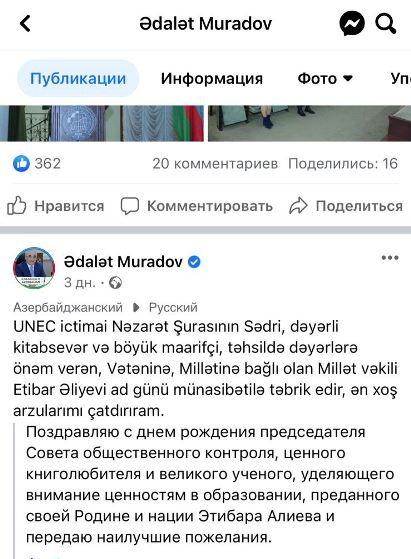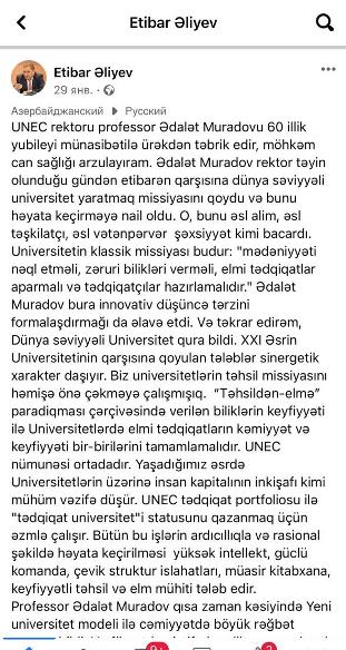 Keçək mətləbə: külli Azərbaycan bilir ki, Azərbaycan Dövlət İqtisad Universitetinin rektoru Ədalət Muradov külli məmləkətimizə bəlli yolla deputat edilmiş (olmuş) Etibar Əliyevlə yaxındır, dostdur, həmkardır və s. Bunu mən demirəm, Ədalət Muradovun E.Əliyevə verdiyi diplomların, mükafatların sayı, eləcə də ADİU İctimai Şurasının sədri seçməsi, ad günündə özünün fb profilində Etibar Əliyevi məxsusi şəkildə-təhsilimizin gələcək naziri formasında və səviyyəsində tərifləyib təbrikləməsi və s. təsdiqləyir.