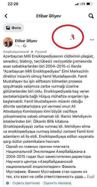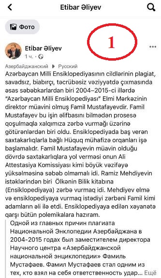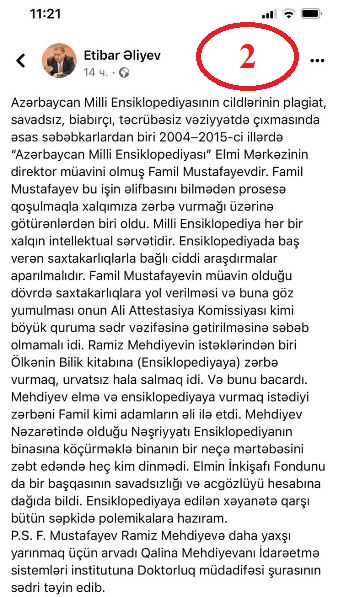 Sitat: “Azərbaycan Milli Ensiklopediyasının cildlərinin plagiat, savadsız, biabırçı, təcrübəsiz səviyyədə çıxmasında əsas səbəbkarlardan biri 2004-2015-ci illərdə “Azərbaycan Milli Ensiklopediyası” Elmi Mərkəzinin direktor müavini olmuş Famil Mustafayevdir. Famil Mustafayev bu işin əlifbasını bilmədən prosesə qoşulmaqla xalqımıza zərbə vurmağı üzərinə götürənlərdən biri oldu. Ensiklopediyada baş verən saxtakarlıqlarla bağlı hüquq mühafizə orqanları işə başlamalıdır. Famil Mustafayevin müavin olduğu dövrdə saxtakarlıqlara yol verməsi onun Ali Attestasiya Komissiyası kimi vəzifəyə yüksəlməsinə səbəb olmamalı idi. Ramiz Mehdiyevin istəklərindən biri Ölkənin Bilik kitabına (Ensiklopediyaya) zərbə vurmaq idi. Mehdiyev elmə və ensiklopediyaya vurmaq istədiyi zərbəni Famil kimi adamların əli ilə etdi. Ensiklopediyaya edilən xəyanətə qarşı bütün polemikalara hazıram”.