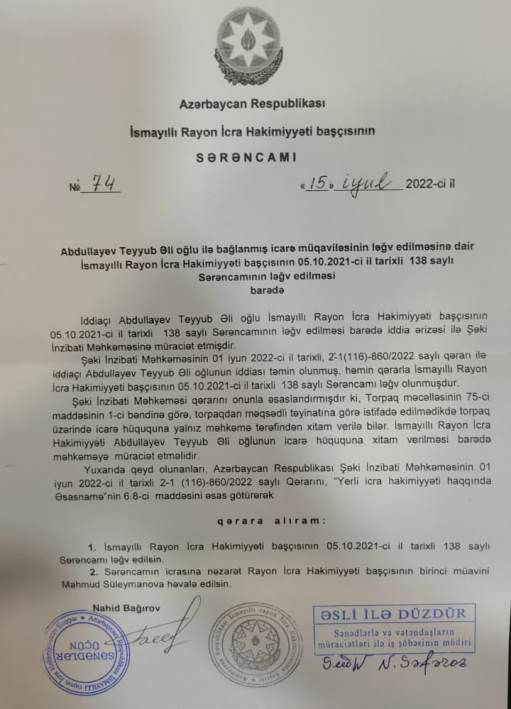 Mən məcbur olub icra başçısı Nahid Bağırovun bu əsassız və qanunsuz hərəkətindən Şəki İnzibati Məhkəmədə iddia qaldırdım. 2022-ci ilin mayın 24-də Şəki İnzibati Məhkəməsində hakim Vidadi Qasımovun sədrliyi ilə keçirilən iclasda mən-fermer Abdullayev Teyyub Əli oğlunun İsmayıllı rayon İcra Hakimiyyətinin 5 oktyabr 2021-ci il tarixli, 135 nömrəli Sərəncamının qanunsuz hesab edilməsi və ləğv olunması haqqında iddia tələbim təmin edildi. 15 iyul 2022-ci il tarixdə isə İsmayıllı RİH başçısı Nahid Bağırov 74 saylı Sərəncamı ilə özünün 5 oktyabr 2021-ci il tarixli, 135 saylı qanunsuz Sərəncamını ləğv etdi, həmin sərəncamın icrası RİH başçısının müavini Mahmud Süleymanova həvalə edildi.