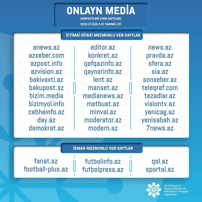 Medianın İnkişafı Agentliyi tərəfindən onlayn media subyektlərinə (veb-saytlara) dəstək layihəsi çərçivəsində elan edilmiş növbəti müsabiqənin nəticələri açıqlandı