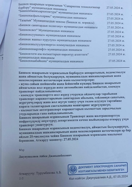 Və Bişkek meriyasının idarə və ərazi idarələrinin, bələdiyyə müəssisə və idarələrinin rəhbərləri hər ayın 25-dək görülən işlərə dair hesabat da təqdim etməlidirlər.