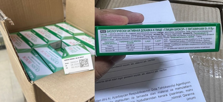 Qida Təhlükəsizliyi Agentliyi tərəfindən aparılan nəzarət tədbirləri zamanı “Nord Star Pharma” MMC-nin Rusiyadan idxal etdiyi 10000 ədəd “Qlisin Biokor” B1 və B6 vitaminləri ilə” əmtəə nişanlı bioloji aktiv qida məhsulunun müayinəsi nəticəsində B1 vitaminin miqdarının normadan aşağı olduğu aşkarlanıb.