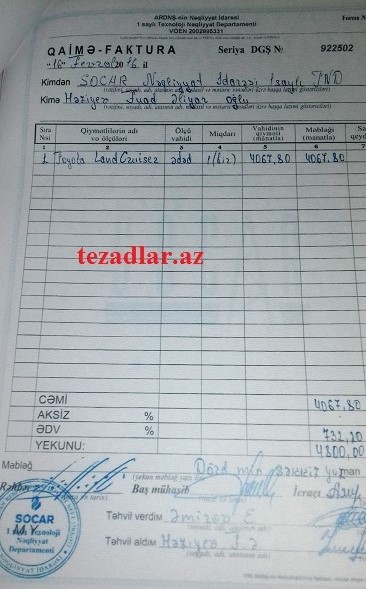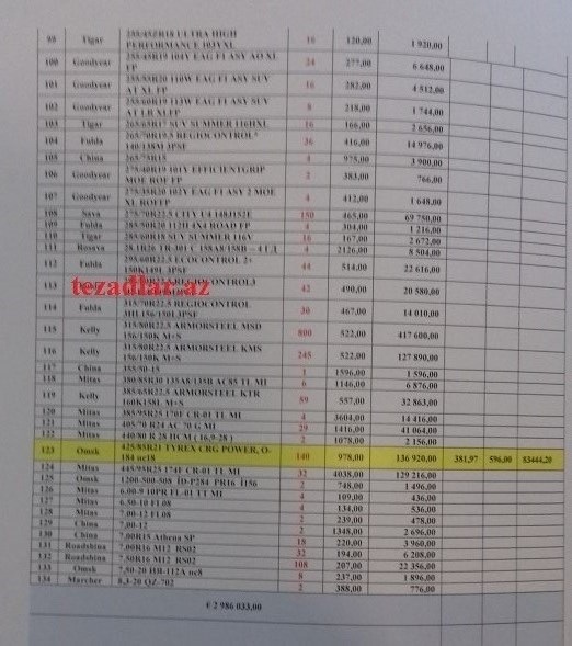 3.119-cu sıra.  315/80R22.5, qiyməti 522 avro vergisiz rüsumsuz. Bakıda vergili rüsumlu 749 azn-dir.  522 X 2=1044 -749= 295! Cədvəldə 245 ədəd olduğunu nəzərə alsaq, 295 azn X 245 ədəd =72 275 azn.