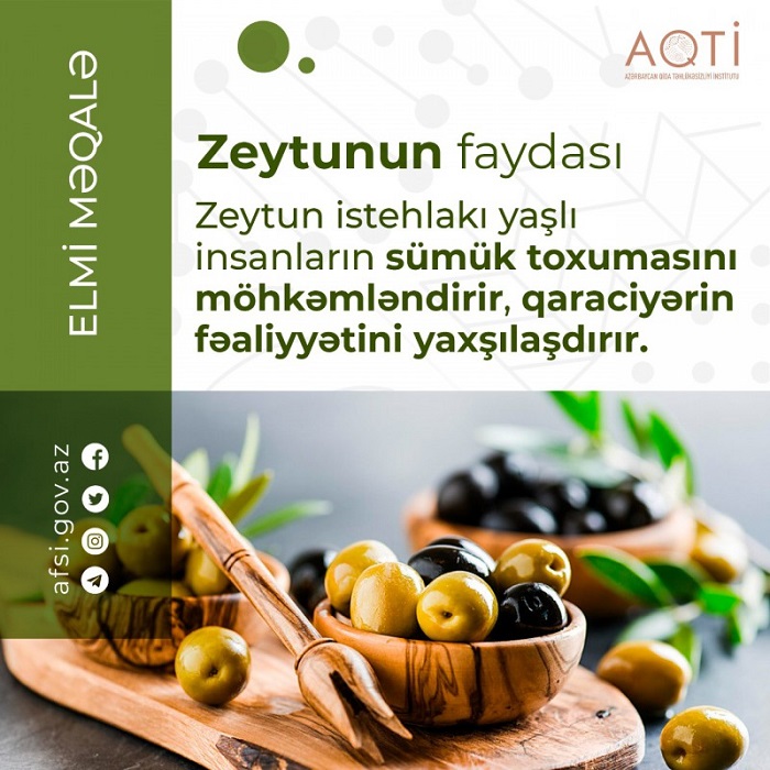 Zeytunun meyvələrindən alınan yağın keyfiyyəti və miqdarı bitkinin sortundan, becərilmə şəraitindən, yetişmə dərəcəsindən, eləcə də emal üsulundan asılıdır. Bitkinin meyvəsindən alınan zeytun yağı üç yerə ayrılır: tibbi, yeyinti və texniki zeytun yağı. Tibbi zeytun yağı əsasən trioleindən ibarət rəngsiz və şəffaf yağdır. Zeytun yağının texniki sortu isə sabunbişirmə sənayesində istifadə olunur. Yeyinti zeytun yağı orqanizm üçün olduqca faydalıdır. Tərkibi olein, linol, palmitin və stearin turşularının qliseridlərindən ibarət sarımtıl rəngli, duru, zəif qoxuya və xoş dada malik yağdır. Zeytun yağının soyuq qəlyanaltılara əlavə olunması sağlamlıq üçün olduqca əhəmiyyətlidir. Zeytun yağının tərkibində olan süzülməmiş yağ turşuları (stearin, olein) qanda xolesterinin miqdarını aşağı düşürərək qocalmanın qarşısının alınmasına müsbət təsir göstərir. Zeytun yağının tərkibində olan antioksidantlar isə xərçəng hüceyrələrinin əmələ gəlməsinin qarşısını alır, dəri və bağırsaq xərçənginin inkişafını ləngidir, qəbizliyi aradan qaldırır, mədənin selikli qişasını bərpa edir. Konservləşdirilmiş zeytunun da qida əhəmiyyəti böyükdür.